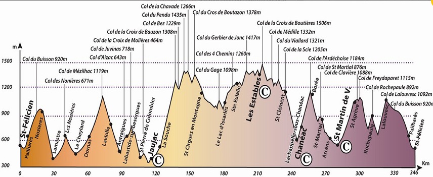 Jour 1 : Départ de St Félicien, arrivé aux sud de l Ardèche au milieu de nulle part dans un gîte en compagnie des vaches et des moutons. 171km 3500m de dénivelé positif. Moyenne 21km/h. 8h10 de selle.